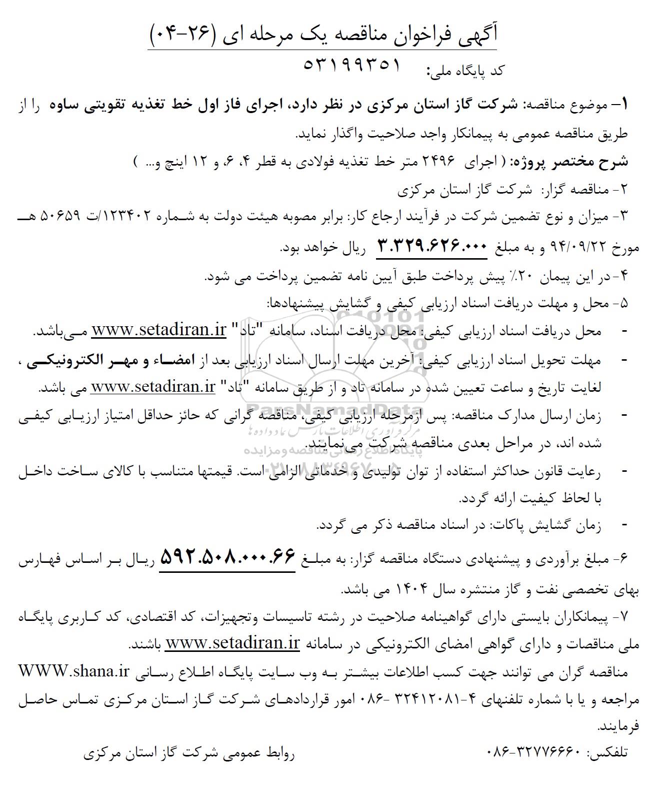 مناقصه اجرای فاز اول خط تغذیه تقویتی ساوه, مناقصه اجرای فاز اول خط تغذیه تقویتی ساوه