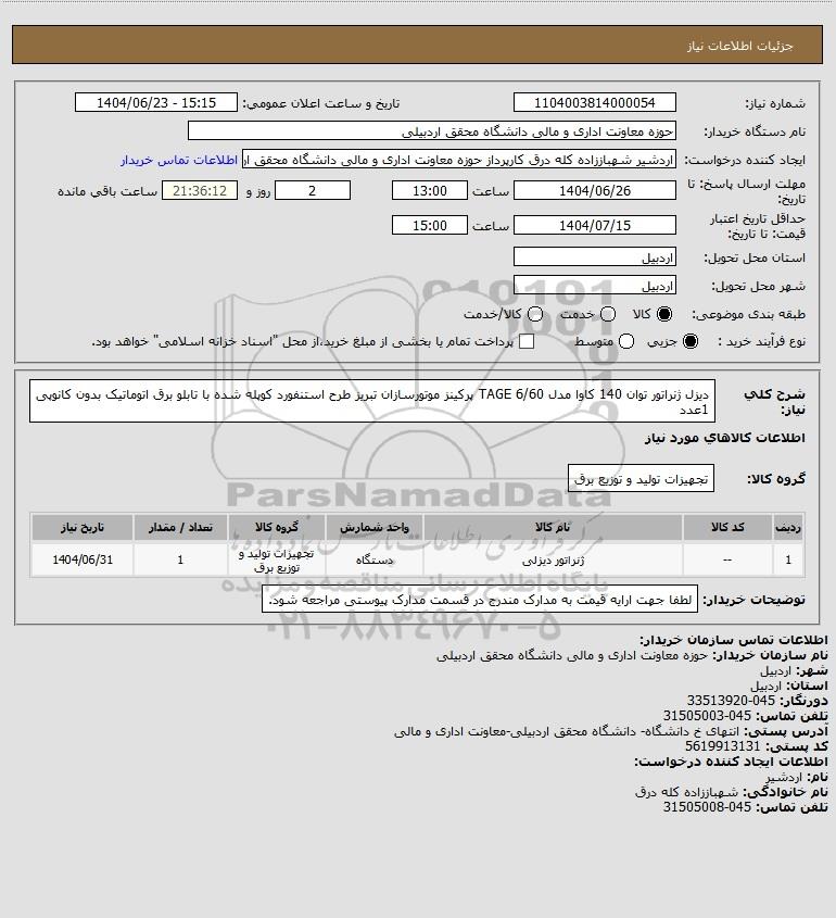 شرح کلی نیاز: دیزل ژنراتور توان 140 کاوا مدل TAGE 6/60 پرکینز موتورسازان تبریز طرح استنفورد کوپله شده با تابلو برق اتوماتیک بدون کانوپی 1عدد