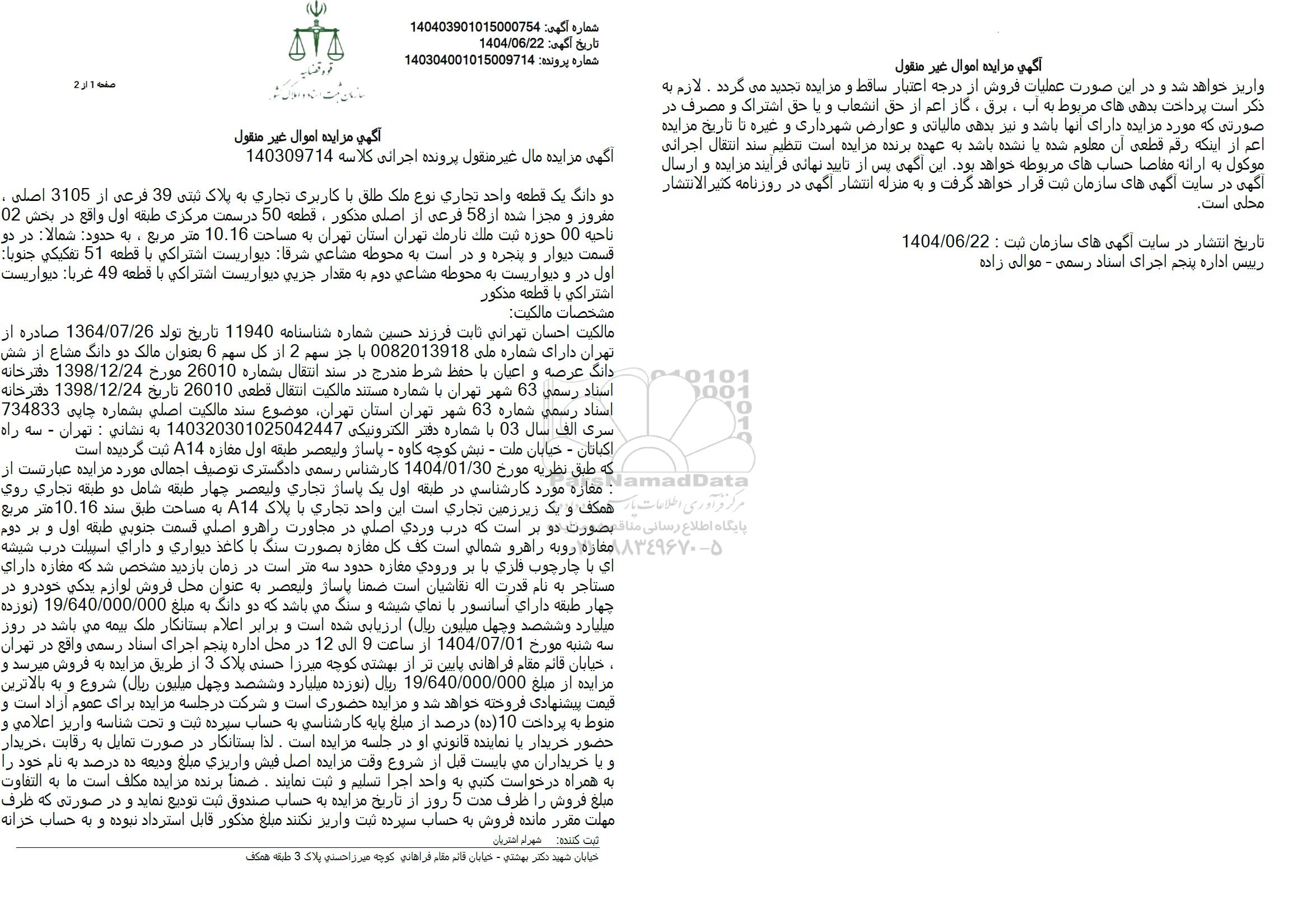 مزایده دو دانگ یک قطعه واحد تجاری به پلاک ثبتی 39 فرعی از 3105 اصلی