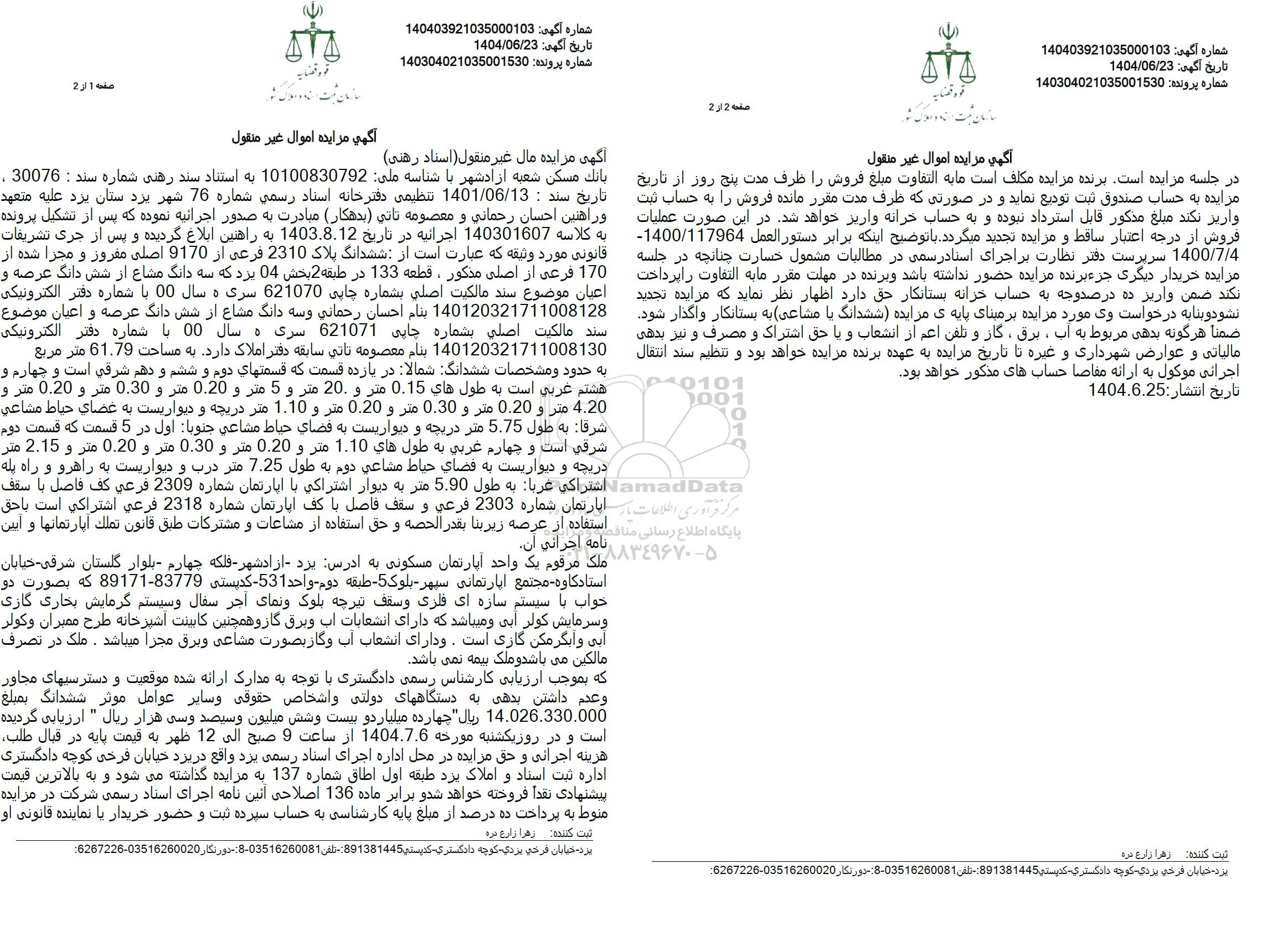 مزایده فروش ششدانگ پلاک 2310 فرعی از 9170 اصلی