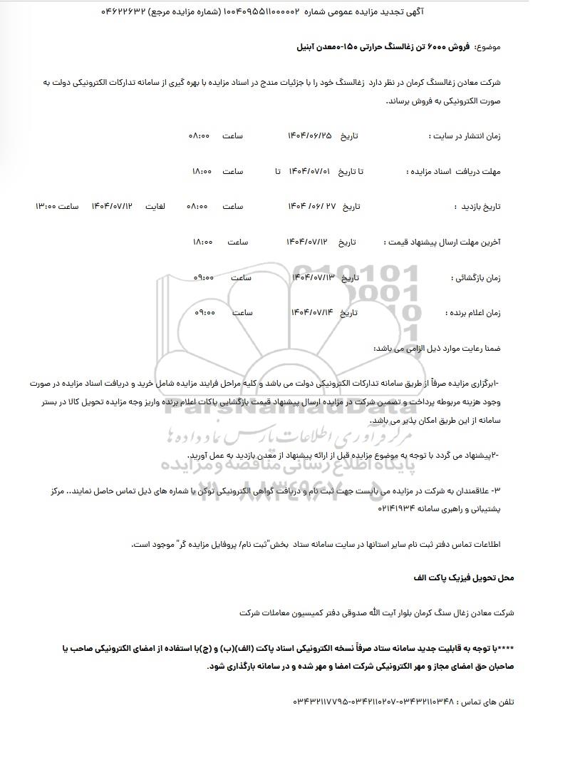 مزایده عمومی تجدید مزایده فروش 6000 تن زغالسنگ حرارتی برگزار میگردد. از کلیه افراد متخصص و شرکتهای واجد شرایط دعوت به عمل میآید تا در این مزایده با کد خبرگزاری پارس نماد : 9544514 شرکت نمایند تاریخ شروع مزایده : 1404/06/23 مهلت شرکت در مزایده: تا پایان روز 1404/07/01