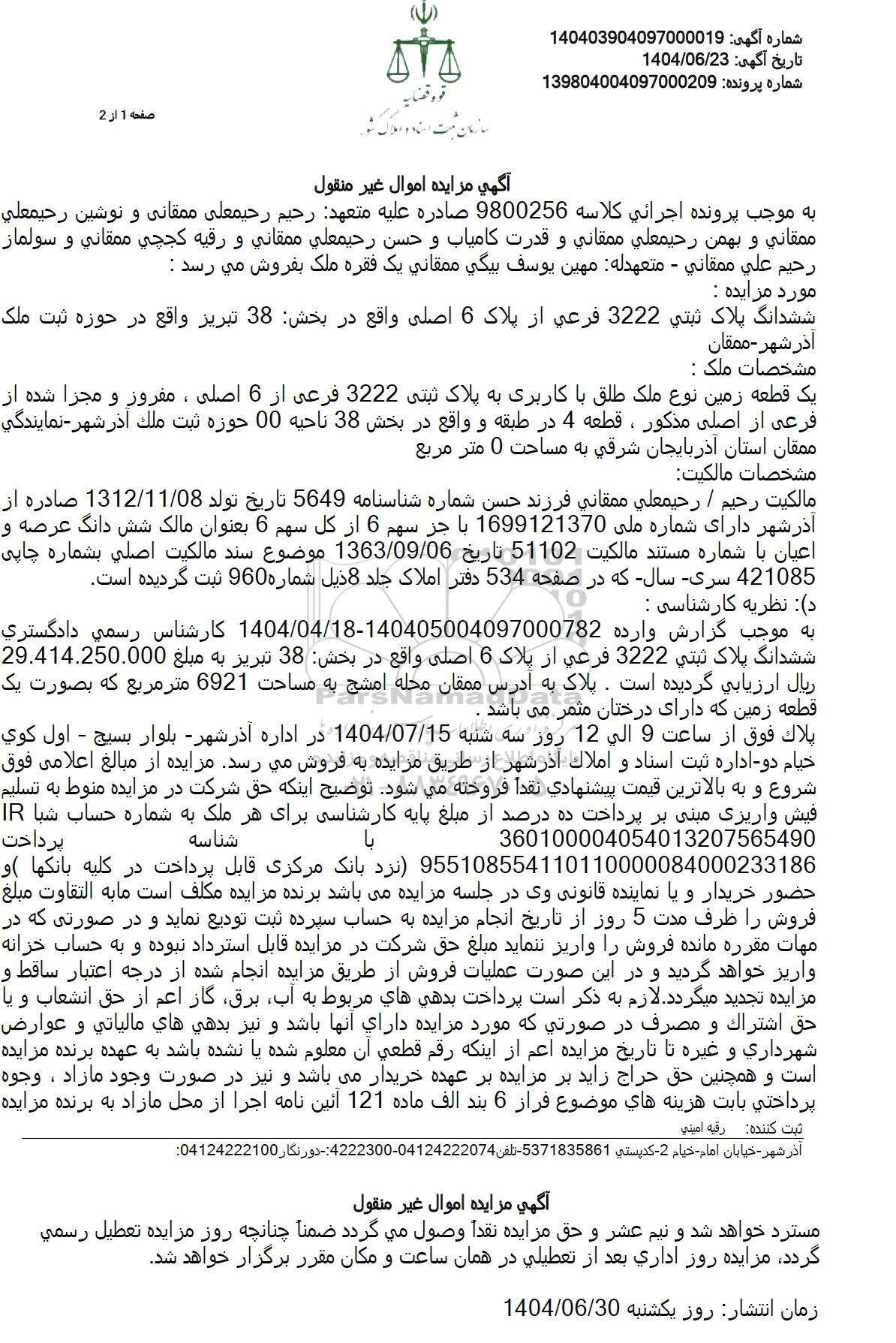 مزایده فروش ملک به پلاک ثبتی 3222 فرعی از 6 اصلی به مساحت 6921