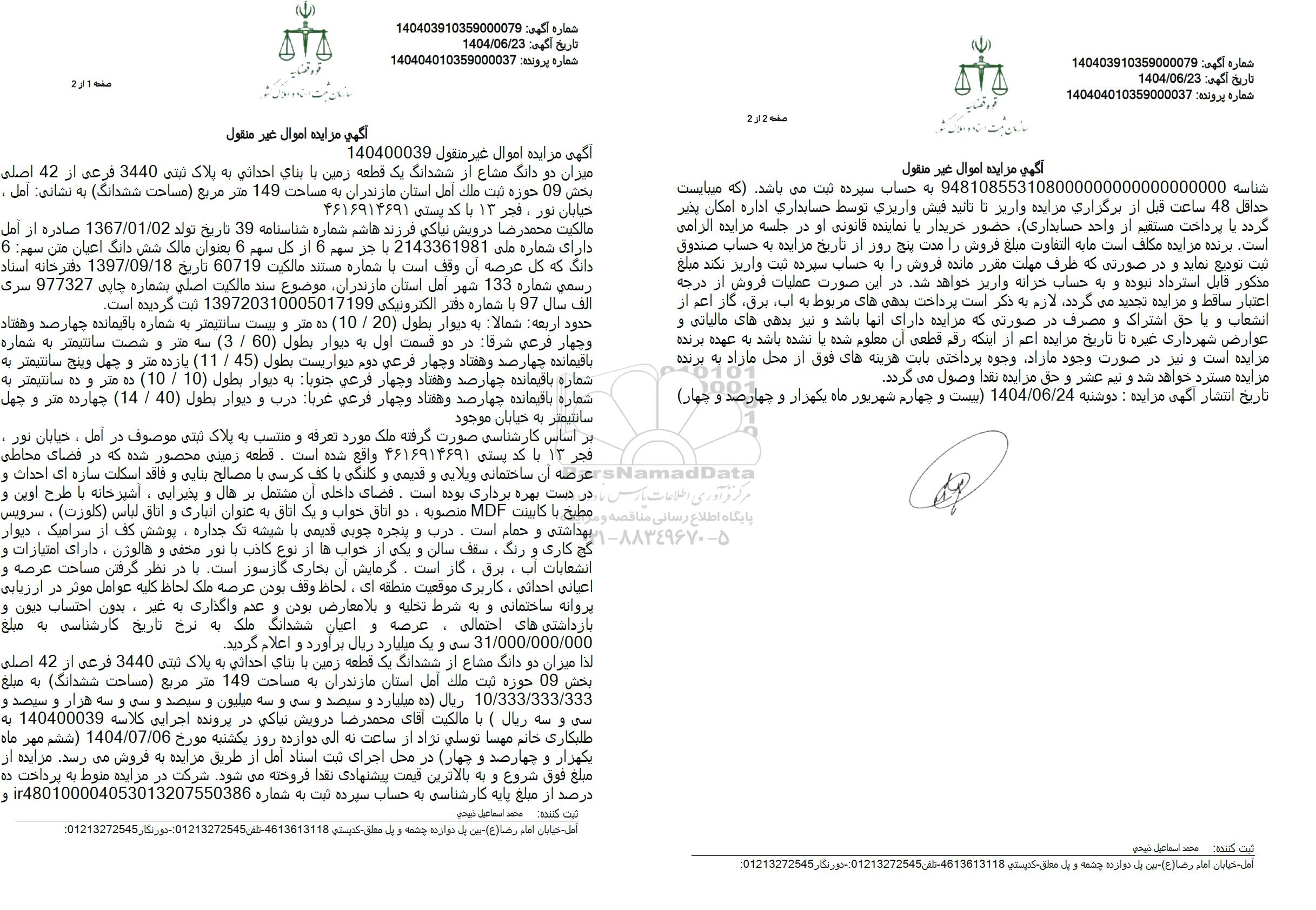 موضوع مزایده : یک قطعه زمین تحت پلاک ثبتی 3440 فرعی از 42 اصلی به مساحت 149 مترمربع به ارزش 10.333.333.333 ریال