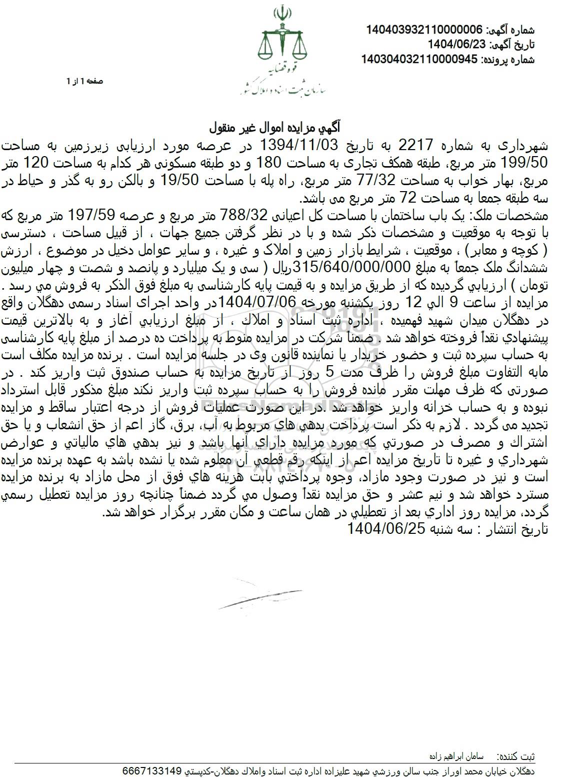 مزایده فروش عرصه زیر زمین به مساحت 199.50 مترمربع