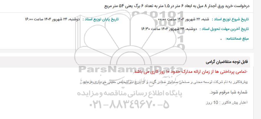 استعلام خرید ورق آجدار 8 میل به ابعاد 6 متر در 1.5 متر به تعداد 6 برگ یعنی 54 متر مربع, استعلام خرید ورق آجدار 8 میل به ابعاد 6 متر در 1.5 متر به تعداد 6 برگ یعنی 54 متر مربع