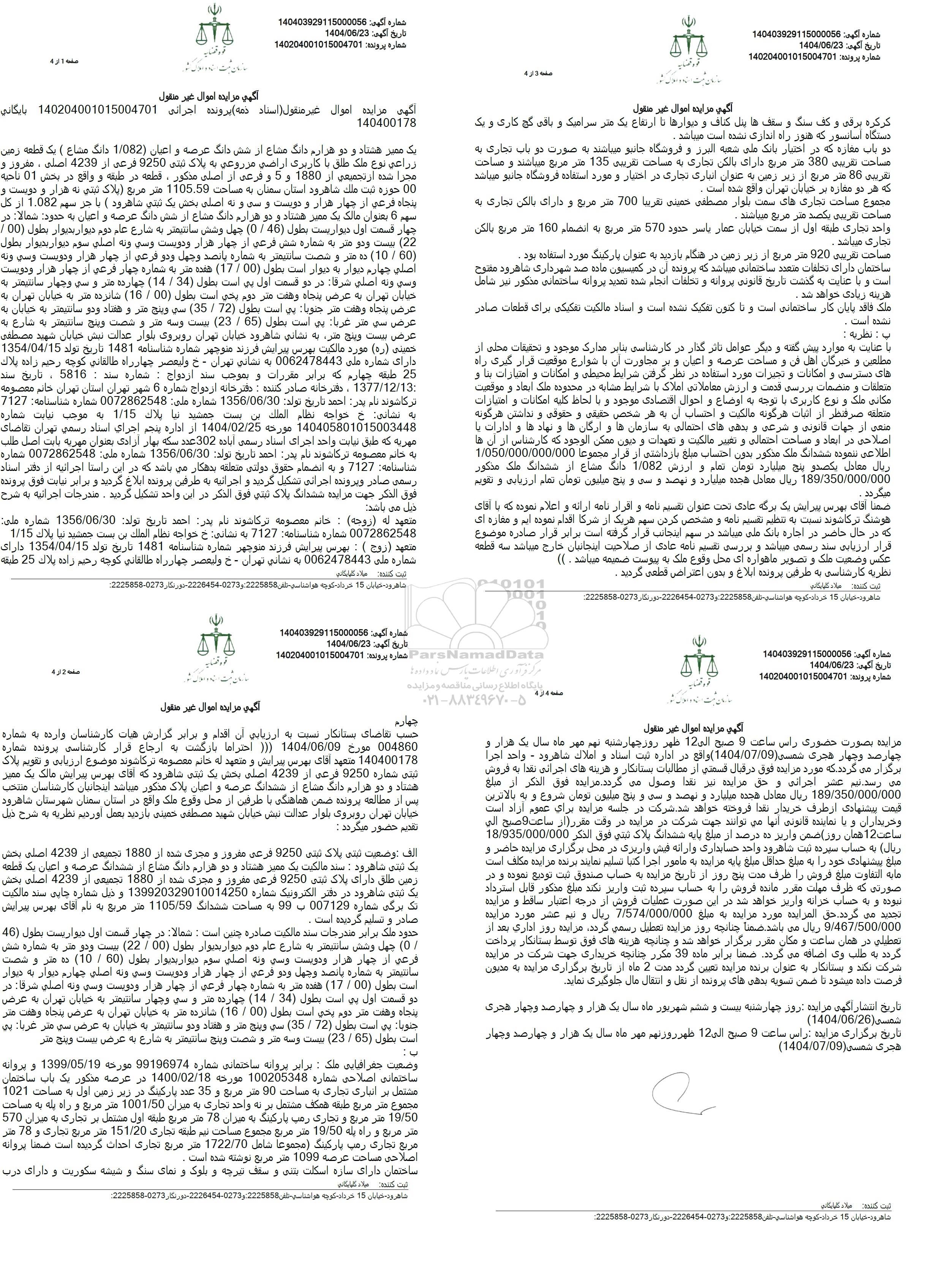 مزایده عمومی مزایده یک ممیز هشتاد و دو هزارم دانگ مشاع از ششدانگ عرصه و اعیان برگزار میگردد. از کلیه افراد متخصص و شرکتهای واجد شرایط دعوت به عمل میآید تا در این مزایده با کد خبرگزاری پارس نماد : 9544533 شرکت نمایند تاریخ شروع مزایده : 1404/06/23 مهلت شرکت در مزایده: تا پایان روز 1404/07/09