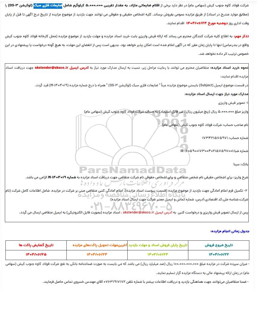 شرکت فولاد کاوه جنوب کیش (سهامی عام در نظر دارد برخی از اقلام ضایعاتی مازاد به مقدار تقریبی 5.000.000 کیلوگرم شامل ضایعات فلزی سبک لوکیشن (3-0) را مطابق موارد مندرج در استاد از طریق مزایده عمومی بفروش برساند کلیه اشخاص حقیقی و حقوقی میتوانند جهت بازدید از موضوع مزایده از تاریخ درج آگهی تا قبل از پایان وقت اداری روز دوشنبه مورخ 1404.6.24 اقدام نمایند.