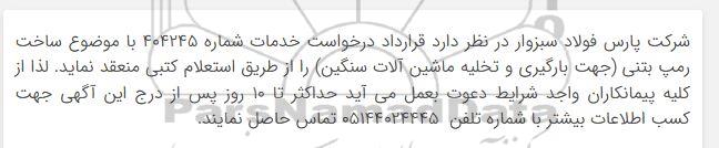 شرکت پارس فولاد سبزوار در نظر دارد قرارداد درخواست خدمات شماره 404245 با موضوع ساخت رمپ بتنی جهت بارگیری و تخلیه ماشین آلات سنگین را از طریق استعلام کتبی منعقد نماید. لذا از کلیه پیمانکاران واجد شرایط دعوت بعمل می آید حداکثر تا 10 روز پس از درج این آگهی جهت کسب اطلاعات بیشتر با شماره تلفن 05144024445 تماس حاصل نمایند.
