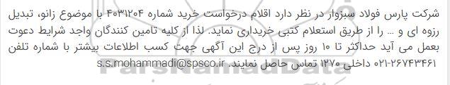 شرکت پارس فولاد سبزوار در نظر دارد اقلام درخواست خرید شماره 4031204 با موضوع زانو ، تبدیل رزوه ای و ... را از طریق استعلام کتبی خریداری نماید. لذا از کلیه تامین کنندگان واجد شرایط دعوت بعمل می آید حداکثر تا 10 روز پس از درج این آگهی جهت کسب اطلاعات بیشتر با شماره تلفن 26743461-021 داخلی 1270 تماس حاصل نمایند.