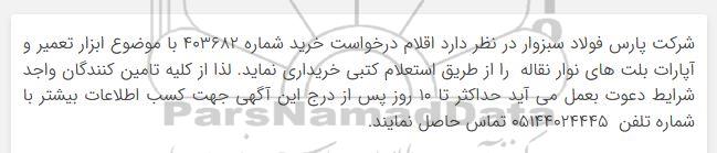 شرکت پارس فولاد سبزوار در نظر دارد اقلام درخواست خدمات شماره 403682 با موضوع ابزار تعمیر و آپارات بلت های نوار نقاله را از طریق استعلام کتبی خریداری نماید. لذا از کلیه تامین کنندگان واجد شرایط دعوت بعمل می آید حداکثر تا 10 روز پس از درج این آگهی جهت کسب اطلاعات بیشتر با شماره تلفن 05144024445 تماس حاصل نمایند.