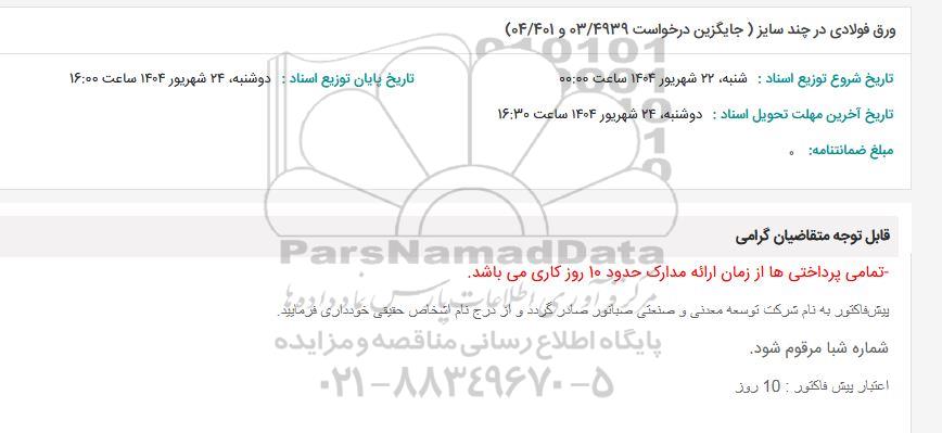 ورق فولادی در چند سایز (جایگزین درخواست 03/4939 و 04/401)
