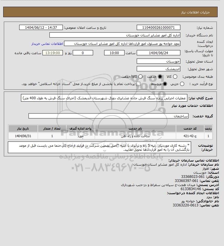 شرح کلی نیاز: عملیات اجرایی پروژه سنگ فرش جاده عشایری دورق شهرستان اندیمشک (اجرای سنگ فرش به طول 400 متر)