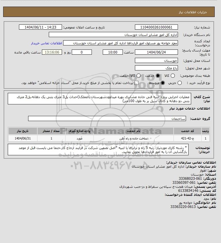 شرح کلی نیاز: عملیات اجرایی پروژه ابنیه فنی جاده عشایری بهره میداوودشهرستان باغملک(احداث پل3 متری بتنی یک دهانه،پل2 متری بتنی دو دهانه و کانال سیل بر به طول 100متر)