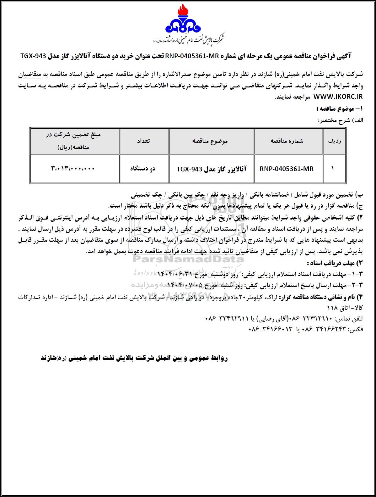 آگهی فراخوان مناقصه عمومی یک مرحله ای شماره RNP- 0405361 -MR تحت عنوان خرید دو دستگاه آنالایزر گاز مدل TGX-943