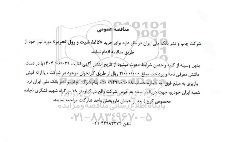 شرکت چاپ و نشر بانک ملی ایران در نظر دارد برای خرید «کاغذ شیت و رول تحریر» مورد نیاز خود از طریق مناقصه اقدام نماید.
