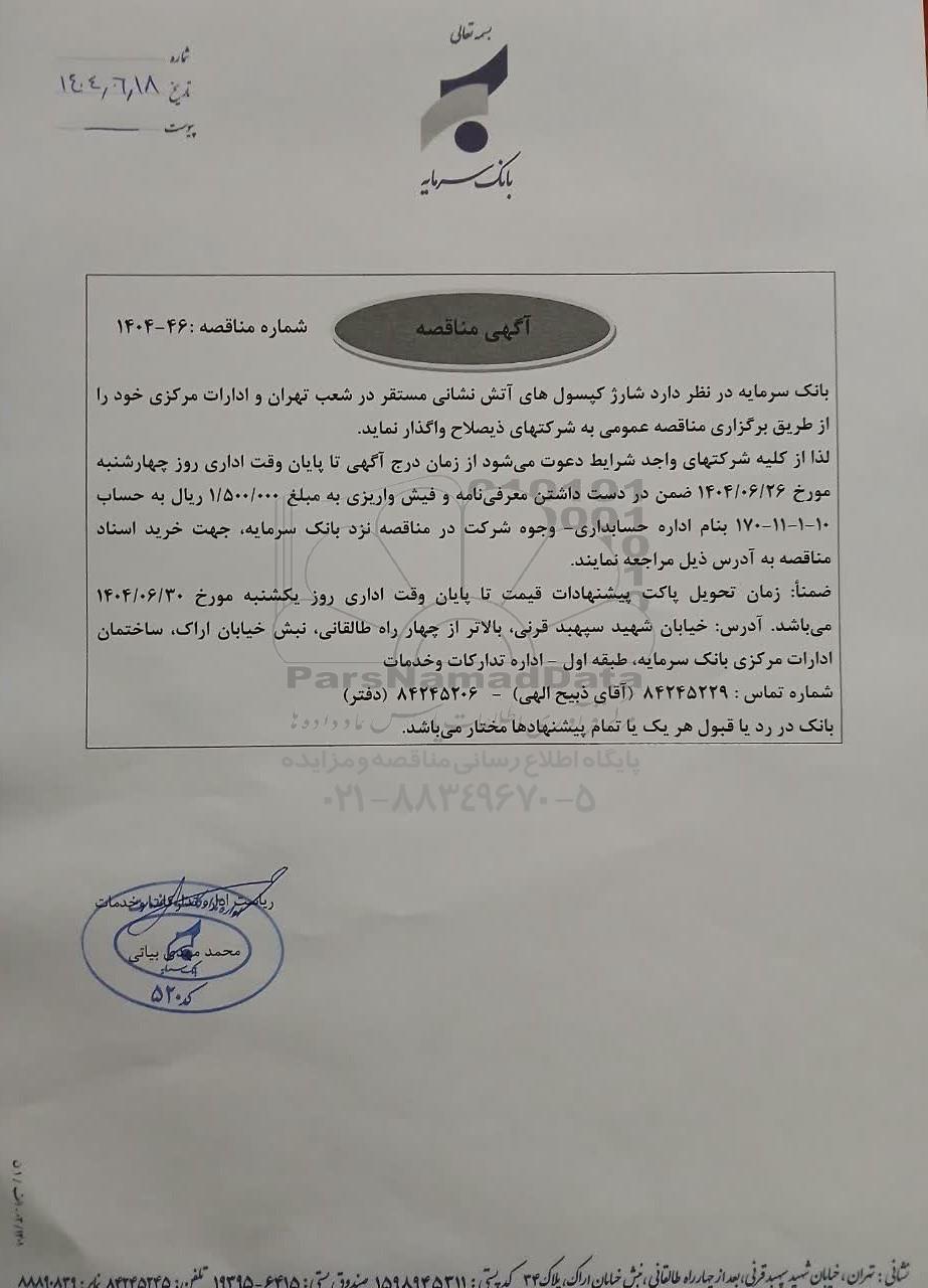 بانک سرمایه در نظر دارد شارژ کپسول های آتش نشانی مستقر در شعب تهران و ادارات مرکزی خود را از طریق برگزاری مناقصه عمومی به شرکتهای ذیصلاح واگذار نماید.