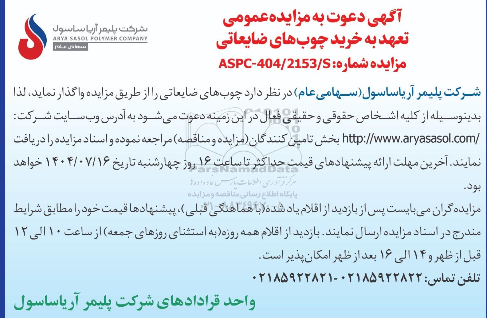 شرکت پلیمر آریاساسول (سهامی عام) در نظر دارد چوب های ضایعاتی را از طریق مزایده واگذار نماید، لذا بدینوسیله از کلیه اشخاص حقوقی و حقیقی فعال در این زمینه دعوت می شود به آدرس وب سایت شرکت: /http://www.aryasasol.com بخش تامین کنندگان (مزایده و مناقصه) مراجعه نموده و اسناد مزایده را دریافت نمایند. آخرین مهلت ارائه پیشنهادهای قیمت حداکثر تا ساعت 16 روز چهارشنبه تاریخ 1404.07.16 خواهد بود.
