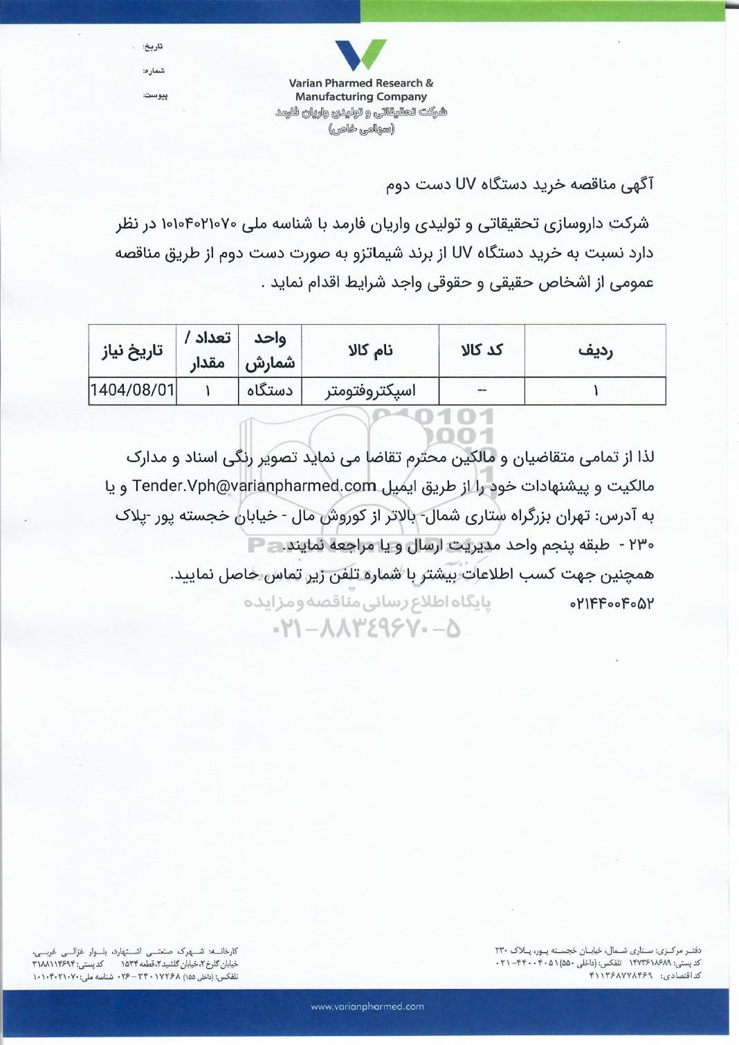 شرکت داروسازی تحقیقاتی و تولیدی واریان فارمد با شناسه ملی 10104021070 در نظر دارد نسبت به خرید دستگاه UV از برند شیماتزو به صورت دست دوم از طریق مناقصه عمومی از اشخاص حقیقی و حقوقی واجد شرایط اقدام نماید .