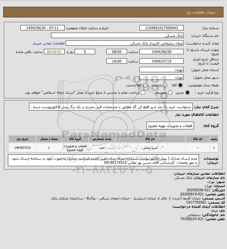شرح کلی نیاز: درخواست خرید یک عد شیر قطع کن گاز مطابق با مشخصات فنی مندرج در یک برگ پیش فاکتورپیوست شده .