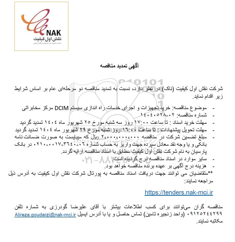 مناقصه گران می توانند برای کسب اطلاعات بیشتر با آقای علیرضا گودرزی به شماره تلفن 09125244299 (واحد زنجیره تامین) تماس حاصل و یا با آدرس ایمیل Alireza.goudarzi@nak-mci.ir مکاتبه نمایند.