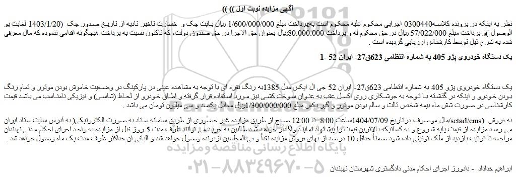 1-یک دستگاه خودروی پژو 405 به شماره انتظامی 623ق27- ایران 52