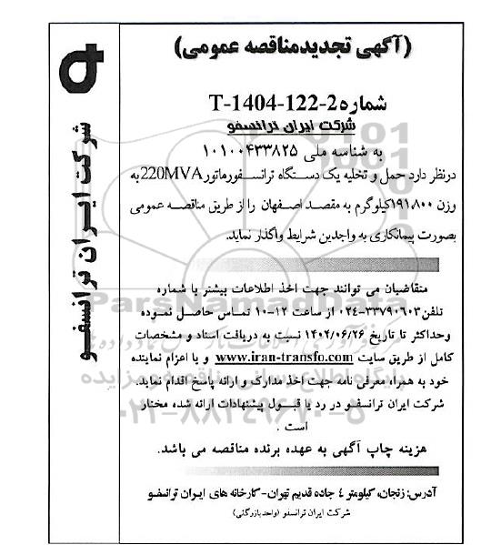 در نظر دارد حمل و تخلیه یک دستگاه ترانسفورماتور 220MVA به وزن 191.800 کیلوگرم به مقصد اصفهان را از طریق مناقصه عمومی بصورت پیمانکاری به واجدین شرایط واگذار نماید.