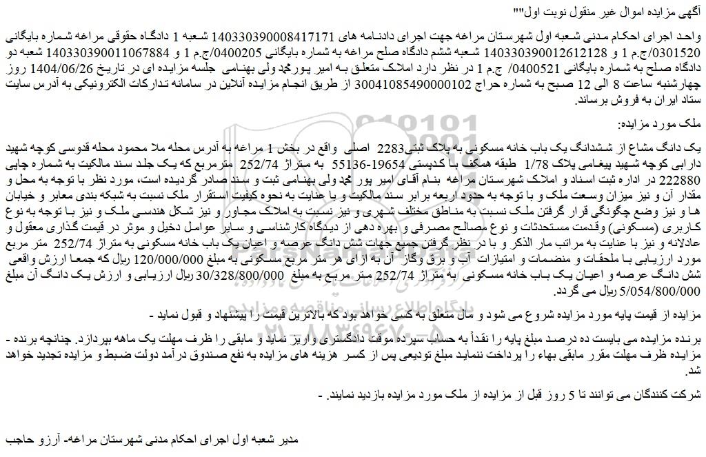 واحد اجرای احکام مدنی شعبه اول شهرستان مراغه جهت اجرای دادنامه های 140330390008417171 شعبه 1 دادگاه حقوقی مراغه شماره بایگانی 0301520/ج.م 1 و 140330390012612128 شعبه ششم دادگاه صلح مراغه به شماره بایگانی 0400205/ج.م 1 و 140330390011067884 شعبه دو دادگاه صلح به شماره بایگانی 0400521/ ج.م 1 در نظر دارد املاک متعلق به امیر پورمحمد ولی بهنامی جلسه مزایده ای در تاریخ 1404/06/26 روز چهارشنبه ساعت 8 الی 12 صبح به شماره حراج 30041085490000102 از طریق انجام مزایده آنلاین در سامانه تدارکات الکترونیکی به آدرس سایت ستاد ایران به فروش برساند.