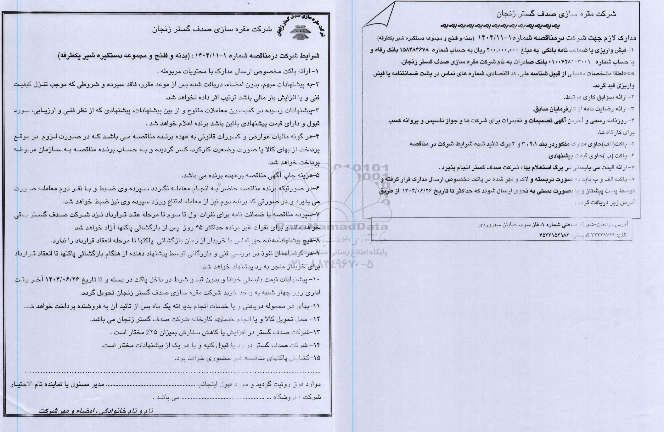 شرایط شرکت در مناقصه شماره 1 - 1404/11 : (بدنه و فلنج و مجموعه دستگیره شیر یکطرفه)
