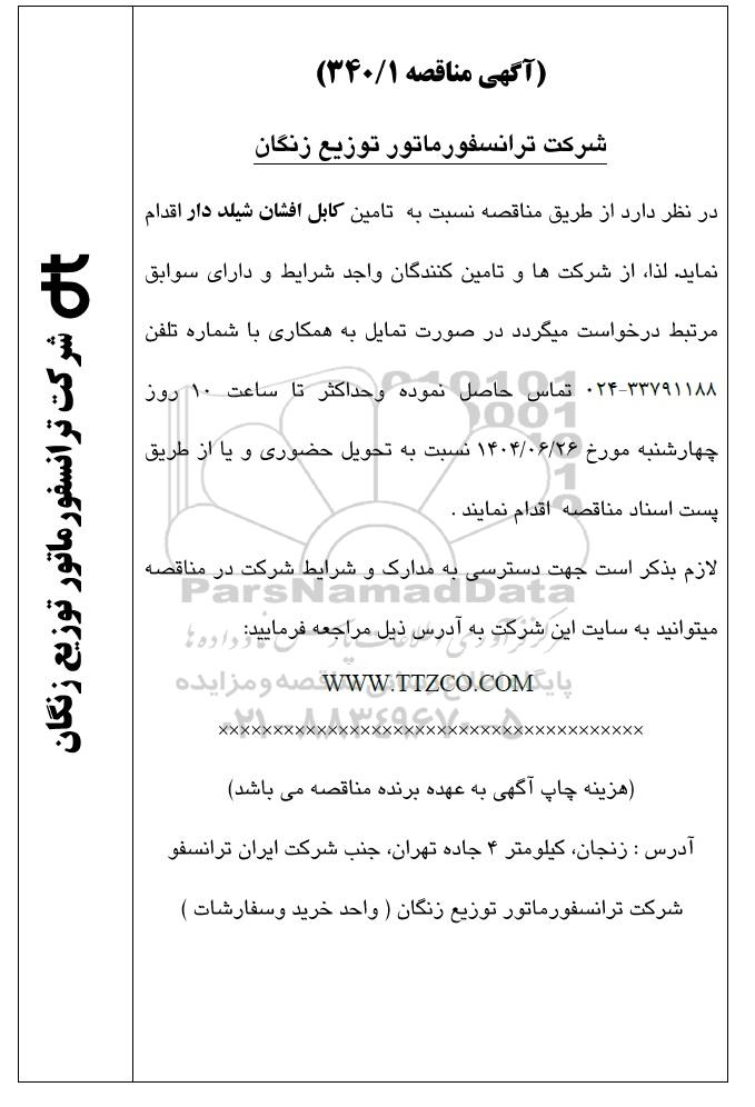 در نظر دارد از طریق مناقصه نسبت به تامین کابل افشان شیلد دار اقدام نماید. لذا، از شرکت ها و تأمین کنندگان واجد شرایط و دارای سوابق مرتبط درخواست میگردد در صورت تمایل به همکاری با شماره تلفن 33791188 - 024 تماس حاصل نموده و حداکثر تا ساعت 10 روز چهارشنبه مورخ 1404.06.26 نسبت به تحویل حضوری و یا از طریق پست اسناد مناقصه اقدام نمایند.