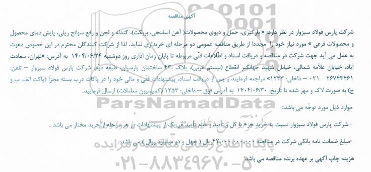 شرکت پارس فولاد سبزوار در نظر دارد: «بارگیری، حمل و دپوی محصولات (آهن اسفنجی، بریکت)، گندله، لجن و رفع سوانح ریلی، پایش دمای محصول و محصولات فرعی» مورد نیاز خود را مجددا از طریق مناقصه عمومی دو مرحله ای خریداری نماید. لذا از شرکت کنندگان محترم در این خصوص دعوت به عمل می آید جهت شرکت در مناقصه و دریافت اسناد و اطلاعات فنی مربوطه تا پایان زمان اداری روز دوشنبه 1404.06.24 به آدرس: «تهران، سعادت آباد، خیابان علامه شمالی، خیابان شهید جهانگیر انقطاع (بیستم غربی)، پلاک 43 ، ساختمان پارسیان، طبقه دوم، شرکت پارس فولاد سبزوار - تلفن: 26743461 - 021 - داخلی 1233» مراجعه فرمایند و پس از دریافت اسناد، پیشنهادات فنی و مالی خود را در پاکات درب بسته مجزا (پاکت الف، ب و ج) به صورت لاک و مهر شده تا تاریخ 1404.06.30 به آدرس فوق - داخلی: 1253 (کمیسیون معاملات) ارسال فرمایید.