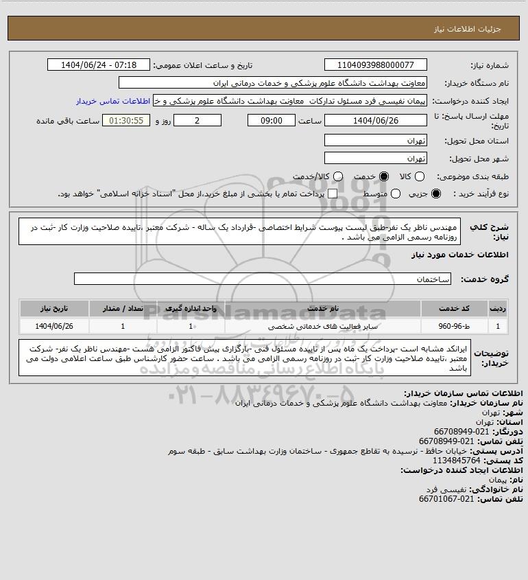 شرح کلی نیاز: مهندس ناظر یک نفر-طبق لیست پیوست شرایط اختصاصی -قرارداد یک ساله - شرکت معتبر ،تاییده صلاحیت وزارت کار -ثبت در روزنامه رسمی الزامی می باشد .