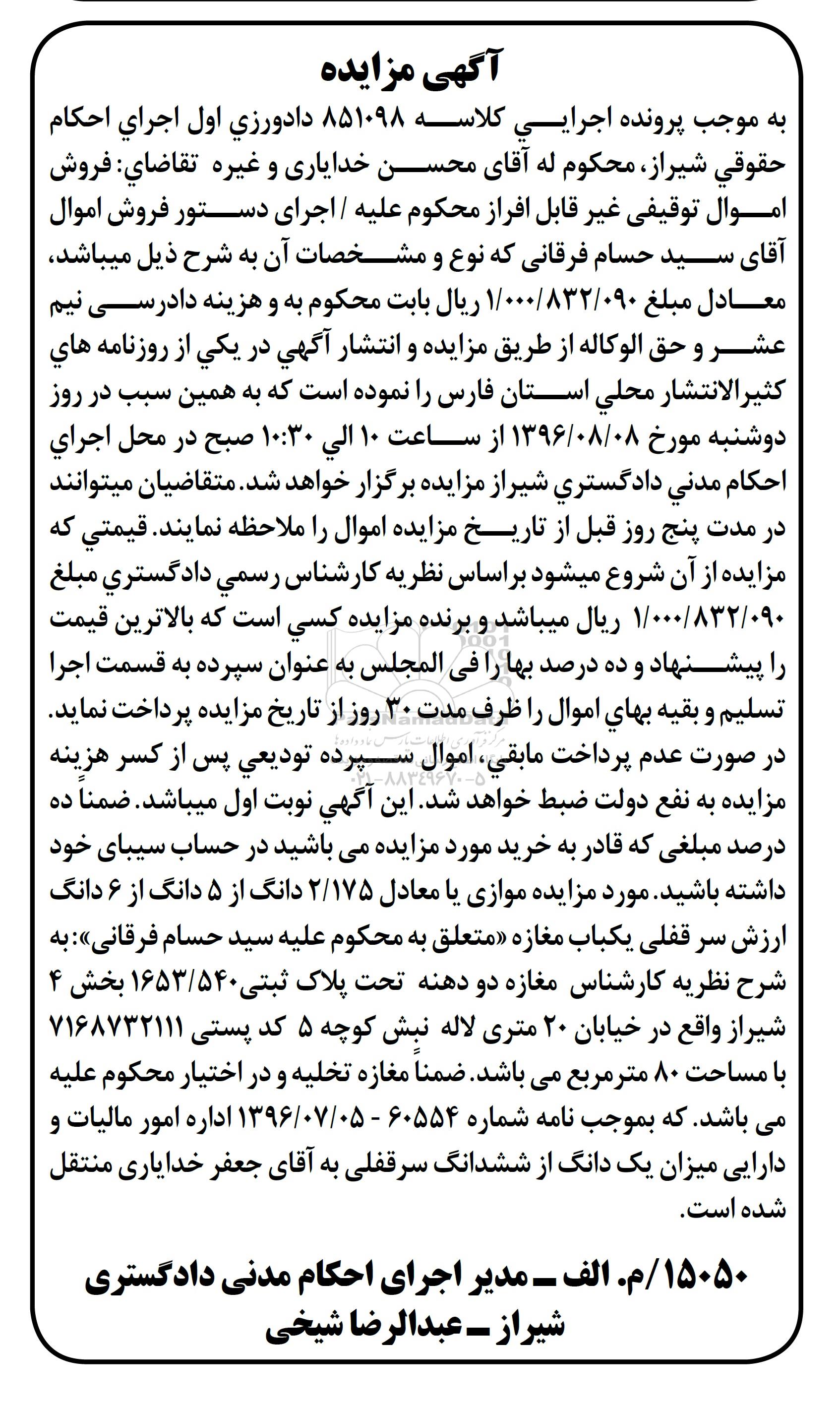 مزایده 2.175 دانگ از 5 دانگ از ششدانگ سرقفلی مغازه کلاسه 851098