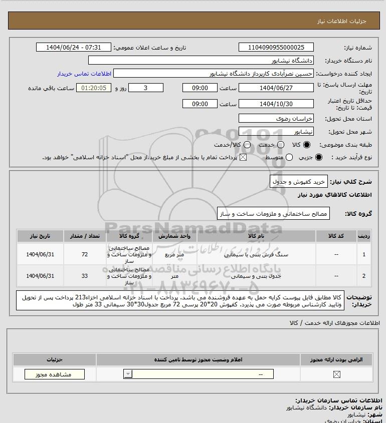 توضیحات خریدار:کالا مطابق فایل پیوست کرایه حمل به عهده فروشنده می باشد. پرداخت با اسناد خزانه اسلامی اخزاء213 پرداخت پس از تحویل وتایید کارشناس مربوطه صورت می پذیرد. کفپوش 20*20 پرسی 72 مربع جدول30*30 سیمانی 33 متر طول