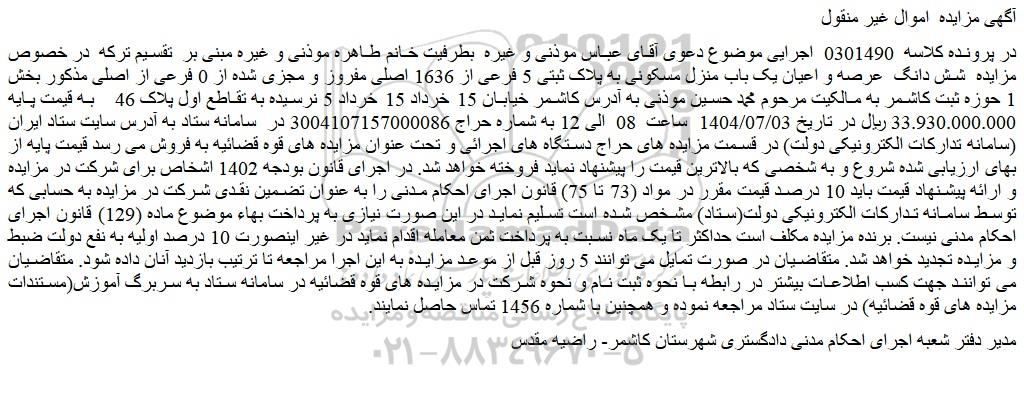 در پرونده کلاسه 0301490 اجرایی موضوع دعوی آقای عباس موذنی و غیره بطرفیت خانم طاهره موذنی و غیره مبنی بر تقسیم ترکه در خصوص مزایده شش دانگ عرصه و اعیان یک باب منزل مسکونی به پلاک ثبتی 5 فرعی از 1636 اصلی مفروز و مجزی شده از 0 فرعی از اصلی مذکور بخش 1 حوزه ثبت کاشمر به مالکیت مرحوم محمد حسین موذنی به آدرس کاشمر خیابان 15 خرداد 15 خرداد 5 نرسیده به تقاطع اول پلاک 46 به قیمت پایه 33.930.000.000 ریال در تاریخ 1404/07/03 ساعت 08 الی 12 به شماره حراج 3004107157000086 در سامانه ستاد به آدرس سایت ستاد ایران (سامانه تدارکات الکترونیکی دولت) در قسمت مزایده های حراج دستگاه های اجرائی و تحت عنوان مزایده های قوه قضائیه به فروش می رسد قیمت پایه از بهای ارزیابی شده شروع و به شخصی که بالاترین قیمت را پیشنهاد نماید فروخته خواهد شد. در اجرای قانون بودجه 1402 اشخاص برای شرکت در مزایده و ارائه پیشنهاد قیمت باید 10 درصد قیمت مقرر در مواد (73 تا 75) قانون اجرای احکام مدنی را به عنوان تضمین نقدی شرکت در مزایده به حسابی که توسط سامانه تدارکات الکترونیکی دولت(ستاد) مشخص شده است تسلیم نماید در این صورت نیازی به پرداخت بهاء موضوع ماده (129) قانون اجرای احکام مدنی نیست. برنده مزایده مکلف است حداکثر تا یک ماه نسبت به پرداخت ثمن معامله اقدام نماید در غیر اینصورت 10 درصد اولیه به نفع دولت ضبط و مزایده تجدید خواهد شد. متقاضیان در صورت تمایل می توانند 5 روز قبل از موعد مزایده به این اجرا مراجعه تا ترتیب بازدید آنان داده شود. متقاضیان می توانند جهت کسب اطلاعات بیشتر در رابطه با نحوه ثبت نام و نحوه شرکت در مزایده های قوه قضائیه در سامانه ستاد به سربرگ آموزش(مستندات مزایده های قوه قضائیه) در سایت ستاد مراجعه نموده و همچنین با شماره 1456 تماس حاصل نمایند.