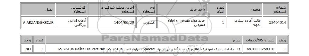 52494914قالب آماده سازی نمونه 1خرید مواد مصرفی و اقلام عمومیکشوری1404/06/29آرمان ارزانی بیرگانیA.ARZANI@KSC.IR