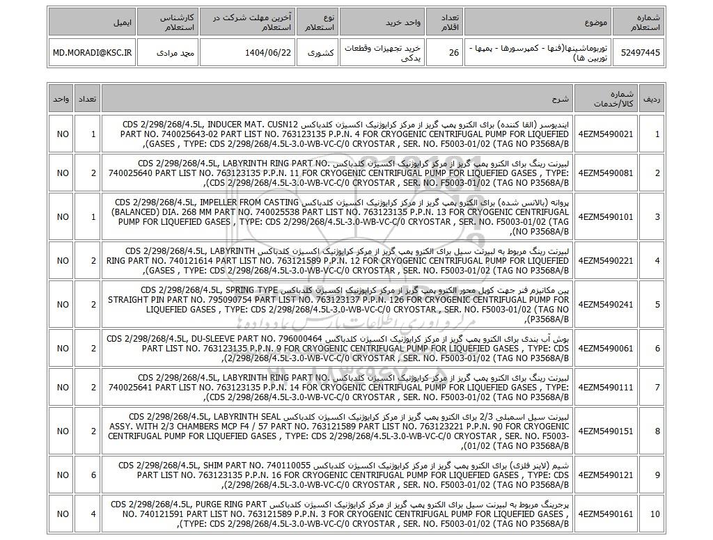 | 52497445 | توربوماشینها(فنها - کمپرسورها - پمپها - توربین ها) | 26 | خرید تجهیزات وقطعات یدکی | کشوری | 1404/06/22 | محمد مرادی | MD.MORADI@KSC.IR |
