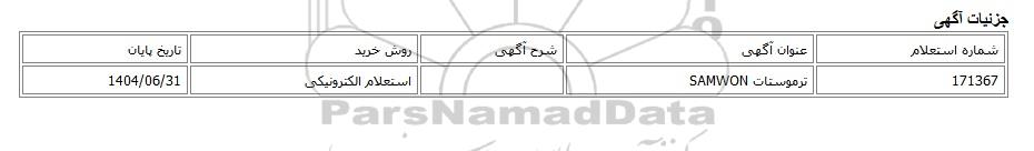 | 171367 | ترموستات SAMWON | استعلام الکترونیکی | 1404/06/31 |