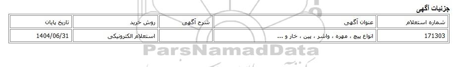 | 171303 | انواع پیچ ، مهره ، واشر ، پین ، خار و ... | استعلام الکترونیکی | 1404/06/31 |