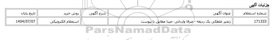 | 171333 | زنجیر غلطکی یک ردیفه - صرفا وارداتی -عینا مطابق با پیوست | استعلام الکترونیکی | 1404/07/07 |