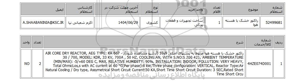 52499681راکتور خشک با هسته هوا1ساخت تجهیزات و قطعات یدکیکشوری1404/06/29اکرم شعبانی نیاA.SHAABANINIA@KSC.IR