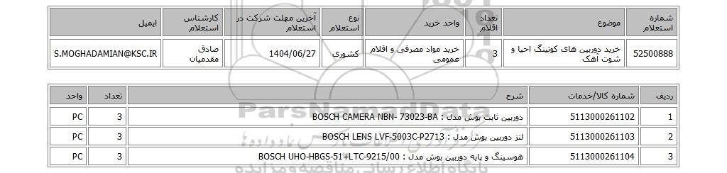 52500888 خرید دوربین های کوتینگ احیا و شوت آهک3خرید مواد مصرفی و اقلام عمومیکشوری1404/06/27صادق مقدمیانS.MOGHADAMIAN@KSC.IR