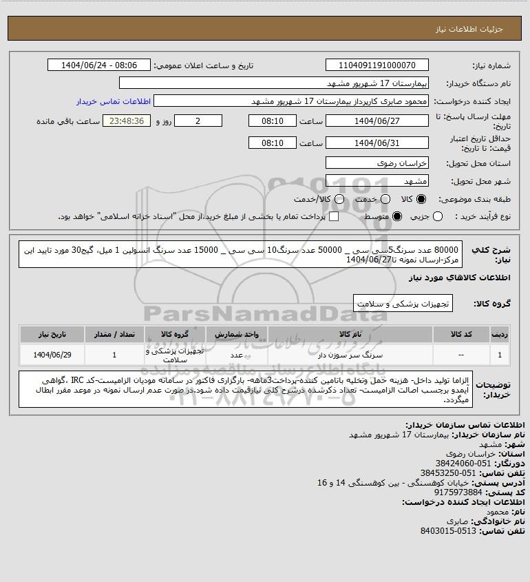 شرح کلی نیاز: 80000 عدد سرنگ5سی سی _ 50000 عدد سرنگ10 سی سی _ 15000 عدد سرنگ انسولین 1 میل، گیج30 مورد تایید این مرکز-ارسال نمونه تا1404/06/27