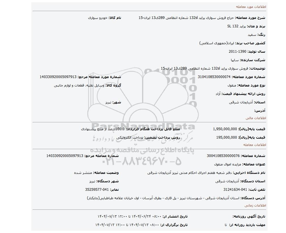 | شرح مورد معامله: حراج فروش سواری پراید 132sl شماره انتظامی 289ی13 ایران-15 | نام کالا: خودرو سواری | |