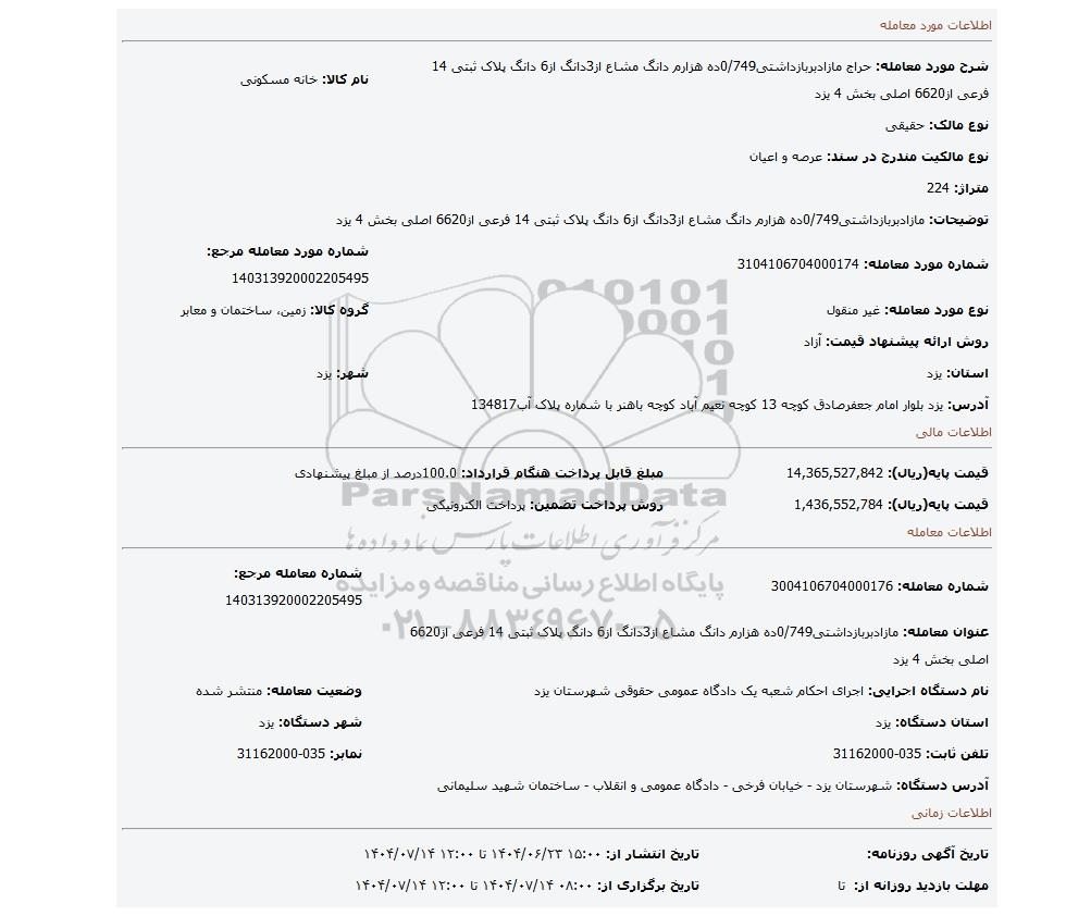 | عنوان معامله: مازادبربازداشتی0/749ده هزارم دانگ مشاع از3دانگ از6 دانگ پلاک ثبتی 14 فرعی از6620 اصلی بخش 4 یزد | ||