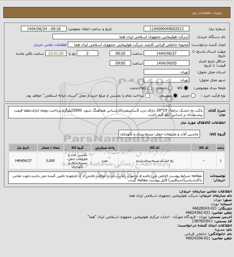 | 1 | -- | یخ خشک بسته بندی شده | عدد | ماشین آلات و ملزومات حمل، بسته بندی و نگهداری | 5,000 | 1404/06/27 |