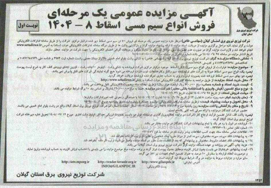 شرکت توزیع نیروی برق استان گیلان (سهامی خاص) در نظر دارد مزایده عمومی یک مرحله ای فروش 50 تن سیم مسی اسقاط دپو شده در انبار مرکزی شرکت را از طریق سامانه تدارکات الکترونیکی
