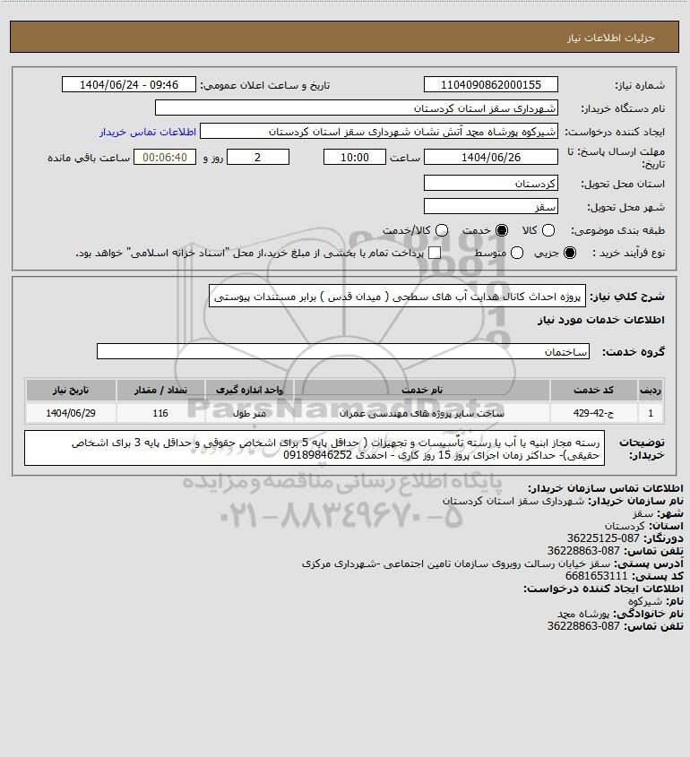 شرح کلی نیاز: پروژه احداث کانال هدایت آب های سطحی ( میدان قدس ) برابر مستندات پیوستی
