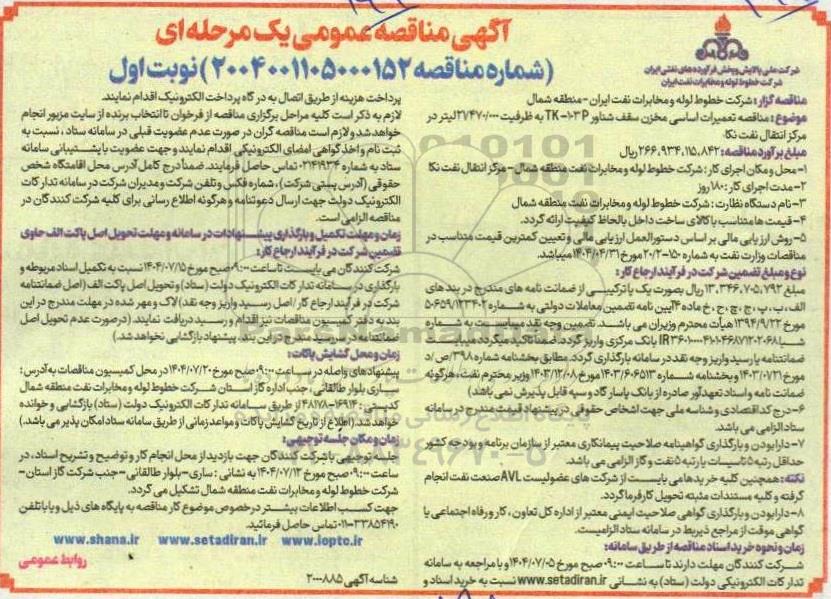 موضوع : مناقصه تعمیرات اساسی مخزن سقف شناور 103p-TK به ظرفیت 21.470.000 لیتر در مرکز انتقال نفت نکا