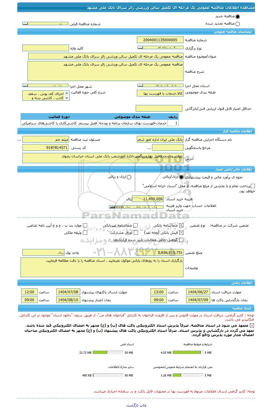 | عنوان/موضوع مناقصه | مناقصه عمومی یک مرحله ای تکمیل سالن ورزشی زائر سرای بانک ملی مشهد | ||||||||