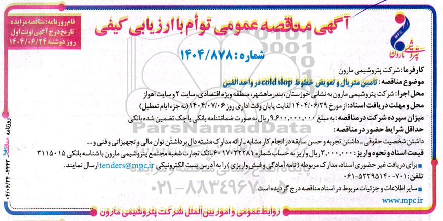 مناقصه تامین متریال و تعویض خطوط cold slop در واحد الفین از کلیه افراد متخصص و شرکتها واجد شرایط دعوت به عمل میآید در مناقصه با کد خبرگزاری پارس نماد: 9548459 شرکت نمایند.
